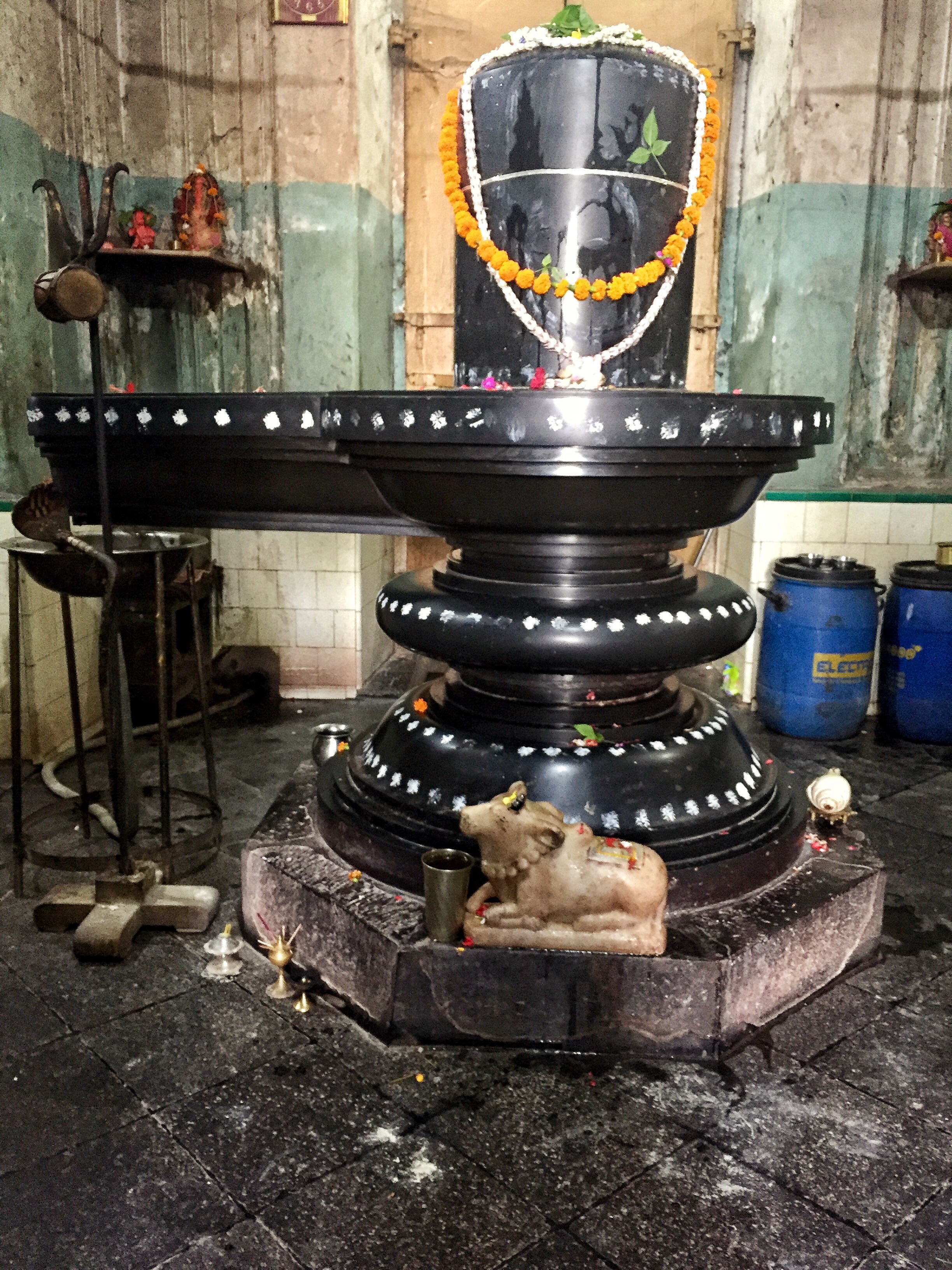 The sanctum sanctorum contains the Shiva linga in the middle made of touchstone ( in Bengali it is called kostipathor). The linga is about three-and-a-half feet tall and is supported by a concrete structure, thereby preventing the stone from collapse.