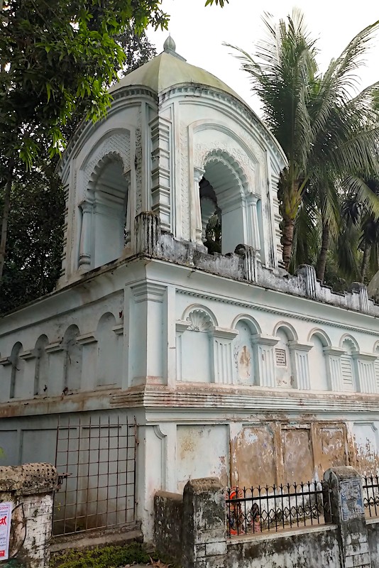 Outside the temple complex in the adjoining area there is a beautiful charchala dolmancha built by Zamindar Krishnamohan Mitra, and, later renovated by Kshetranath Mitra. The architecture is unique in the sense that there is a temple in the ground floor, which is in a raised platform with the dolmancha on the top. Two white elephants adorns the entrance. I have been told that pancham dol (fifth day after Dolyatra) is celebrated here with much pomp and splendour. A number of pilgrims visit this temple during the Dol festival in the Bengali month of Phalgun (March). According to Bengal District Gazetteer by L.S.S. O’Malley, “Close to the temple is a kadamba tree which during the festival is said to yield one flower in honour of the God Krishna, whose favourite flower it is; this is looked upon as a supernatural phenomenon, for the rainy months of July and August are the season in which the plant flowers.”