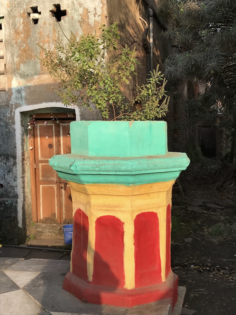Tulsimancha or tulsimandir is “merely a molded base without superstructure.” In many cases tulsimanchas are present in the temple courtyard whereas in domestic household they are kept outside the room and, in many cases, in the housetop where the thakurghar is present. They are generally placed outside thakurghar. After dusk, the ladies blow the conch shell, light the oil lamp and offer incense stick near the tulsimancha. This is a common feature in many rural households.