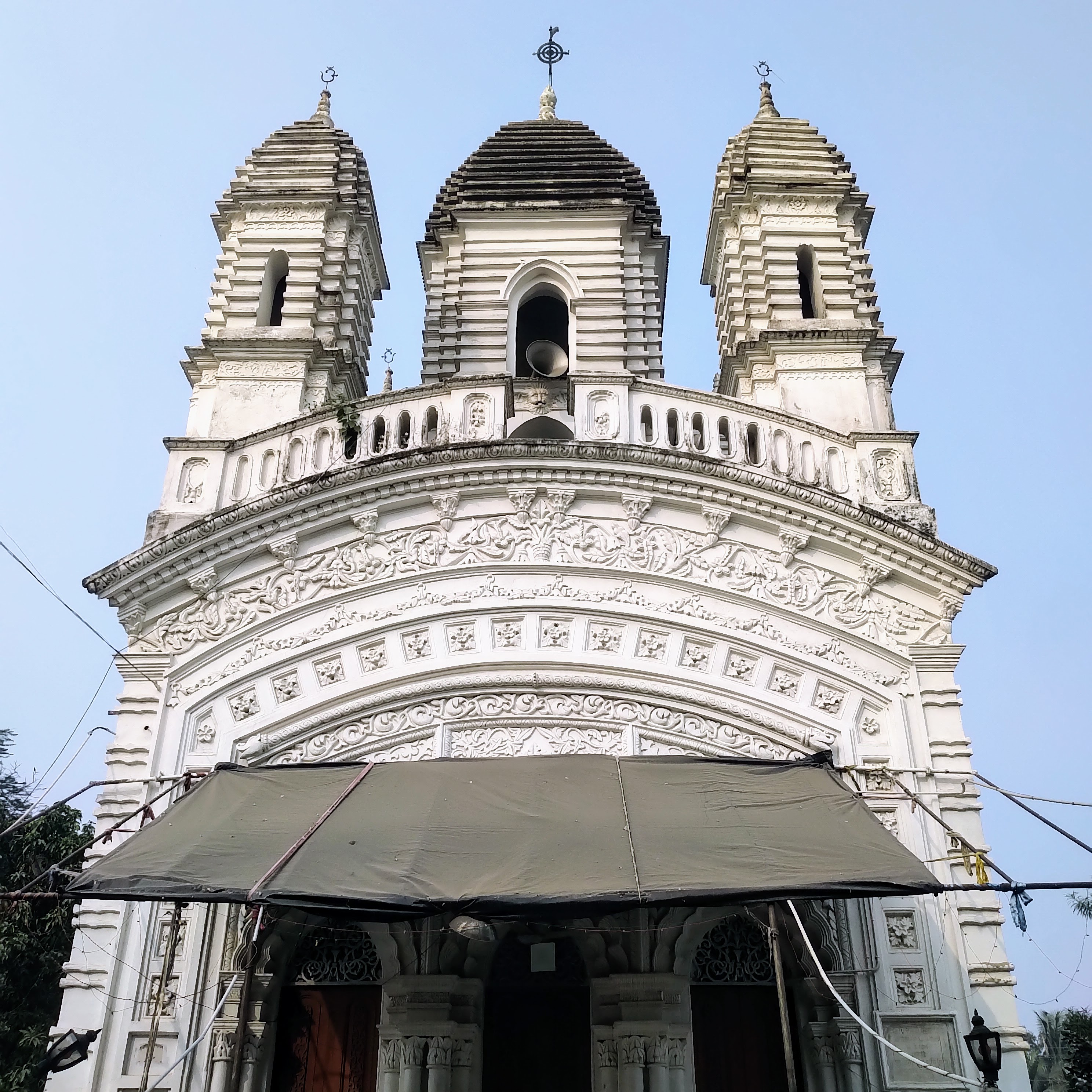 This beautiful white-coloured five pinnacled south-facing temple was built by Giribala Dasi wife of Gopal Krishna Das on 18th Jaistha, 1318 Bangabda (June 1911). Giribala Devi was the great granddaughter of Rani Rashmoni of Janbazar.