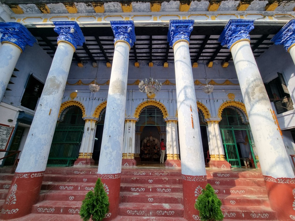 The protima is built in the massive thakurdalan. On the day of Sasthi the ladies of the household welcome the goddess. As the household deity of the Dey family is Sridhar Jiu, the puja is held following the Baisnab rituals, and, as such there is no balidaan or sacrifice. Sridhar Jiu is worshipped daily and during the days of the puja it is brought to the thakurdalan and worshipped with Maa Durga. The massive columns with stucco works remind us of the bygone days.