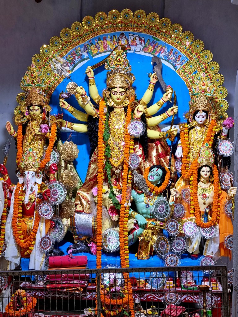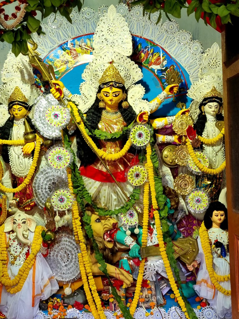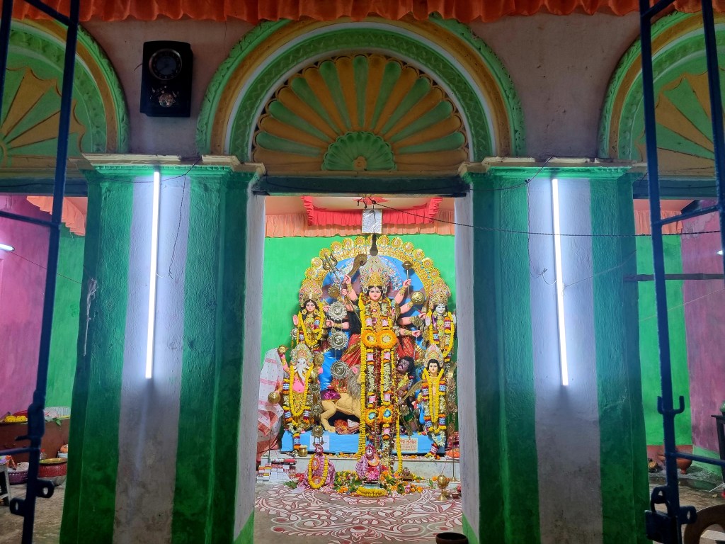 The puja here is performed according to Kalika Puran. As per as the chalchitra is concerned it is triangular in shape and three in number. The head of the lion is like Nrisingha type. The size of idol of Maa Durga is limited to 7-8 feet.