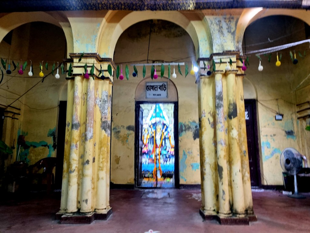 The thakurdalan is pretty old with 30 inch wall but the outer portion is plastered. The puja is performed following the Shakta rituals but no animal sacrifice is performed. There is no practice of Kumari Puja and Dhuno porano in this family.
