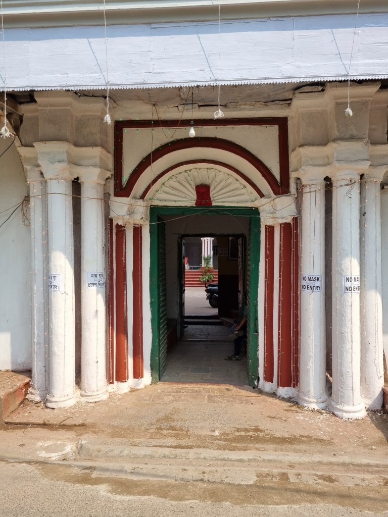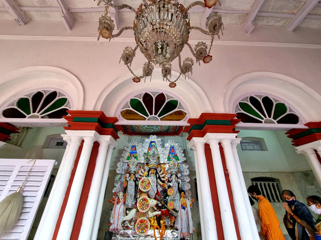 I was so much loved by its beauty that I decided to visit it again and on the afternoon of Nabami I again paid a visit there and this time with my family. At that time Nabami Puja is going on and the courtyard is filled with people of all age groups – some are family members while others have come from nearby places and people who have come all the way from Kolkata. At the outset I must say that this Jamidar Bari is well maintained. There are provisions for hand sanitisers and disposable face masks. Big pedestal fans are placed in different corners and there are chairs also.