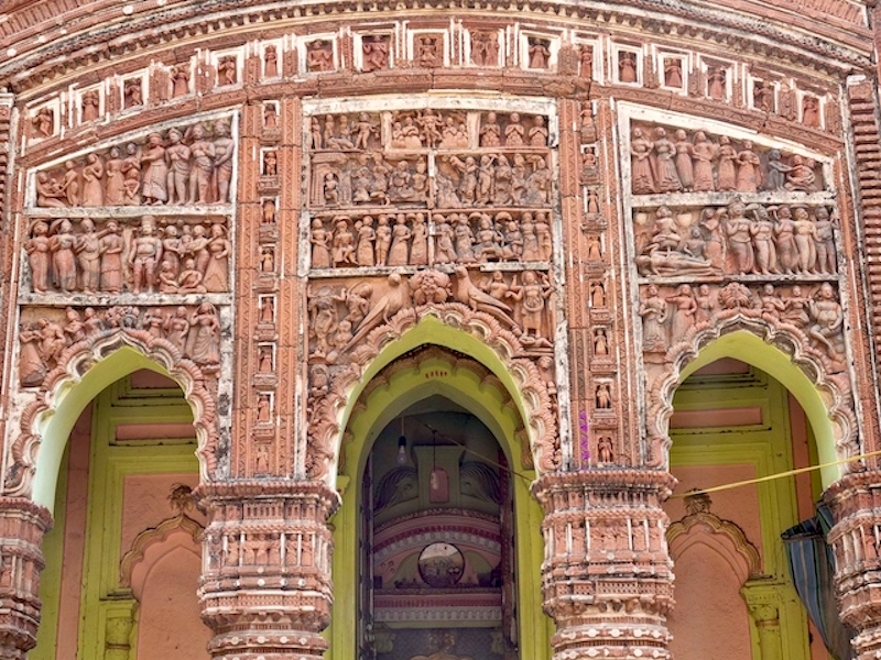 All the four sides of this mandir has excellent terracotta works. But one can photograph only the western and the southern side of the temple as the other two sides creates obstruction – one being the boundary wall of another house. There is in fact no gap in between as the wall of another house blocks it.