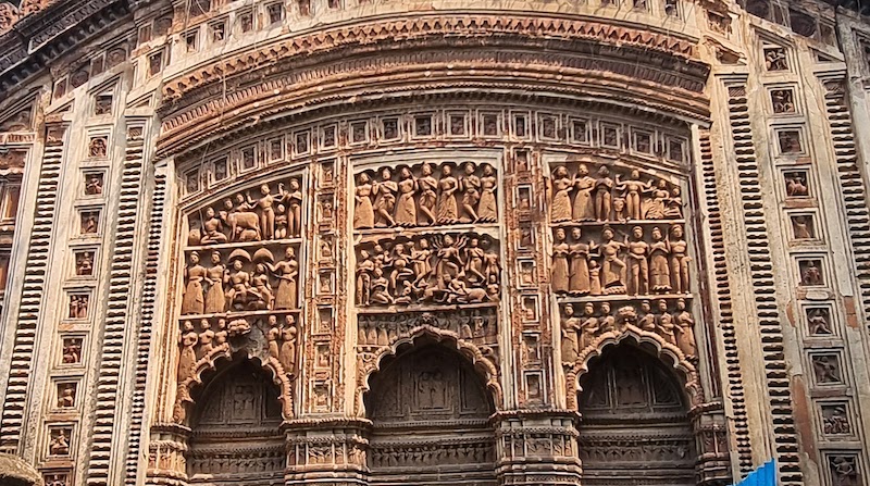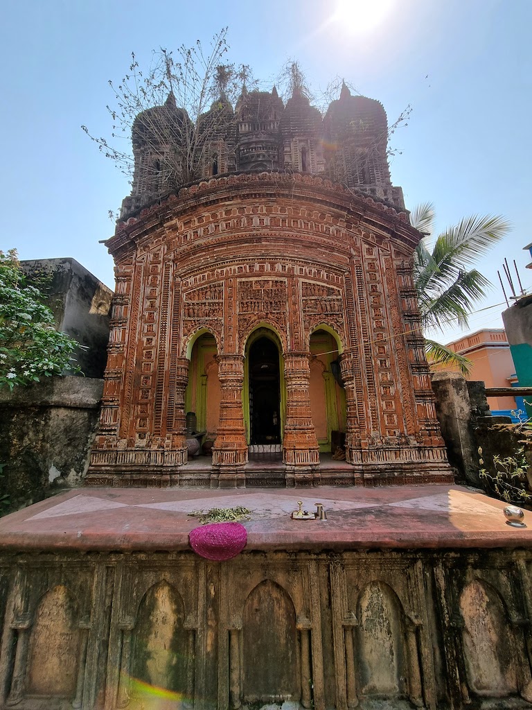 The west-facing Sridhar Temple has exquisite terracotta decorations on all the four sides depicting stories not only from Ramayana, Mahabharata, Krishnalila and Puran but also pictures from social life as well as images of birds and animals. This temple has rich terracotta works at the base, pillars, facades and even on the arches. The terracotta figurines are lively and has more or less retained their form. This temple is not an ASI protected monument like the other three such temples in Kalna.