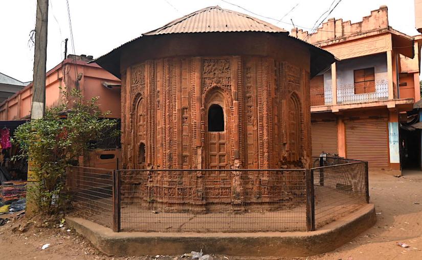 This unique temple belongs to the category of “small octagonal ridged rekha” type. It is placed on a slightly raised platform within an enclosure . The temple is a state protected monument but I do not find any signboard. The temple is believed to have built in circa 18th century. It is connected with a nat-mandir. It seems that that the nat-mandir might be a later addition. The temple can be accessed through an entrance in front of the nat-mandir. The Mahaprabhu Temple houses the deities of Gour Netai and it is assumed that daily worship takes place here.