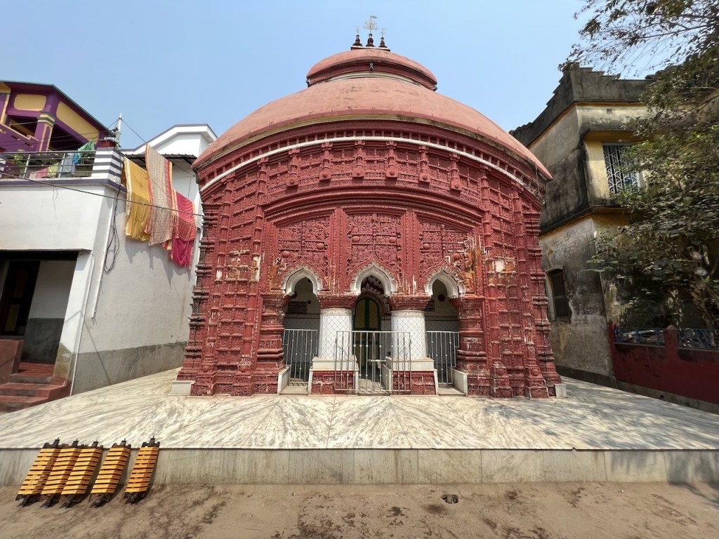 I had visited the town earlier in March this year. Today I decided to visit it again on my way back from Aatpur. The distance is roughly five kilometres from Radhagobinda Temple, Aatpur. This time I went by car and so I parked it a little away from Rajbalhat bazaar. It was a bright sunny afternoon. Just beside the aatchala Sridhar Damodar Temple (founded in 1724) of Sil family there is a renovated dalan with a natmandir belonging to the same family. Here Maa Durga is worshipped as Avaya Durga. The idol is unique and exceptional. I have never come across this type of protima earlier. Enquiring about the same I came to know that when the artist was trying to draw the trinayan of the idol he could not do so as because each and every time he was trying to draw, a fly came and sat at the tip of the brush. As a result of which the trinayan could not be drawn. Thereafter, a fly was drawn in place of trinayan of the goddess. So the goddess has two eyes.