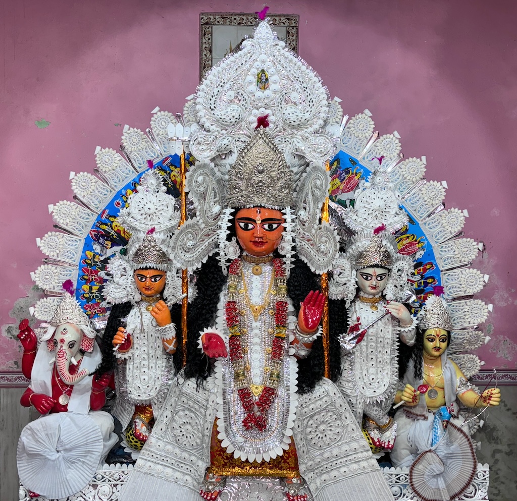 The puja is more than 450 years old. It was started by Lambodar Sil. The Sils were basically the residents of Atghara in Khanakul. That area was flood prone and, therefore, Lambodar Sil came here and started living in Rajbalhat. This family puja was performed according to Sakta rituals. Animal sacrifice is performed on all the days of the puja including Sandhi Puja. There is no practice of kumari puja here but the ritual of dhuno porano is performed during the days of the puja.