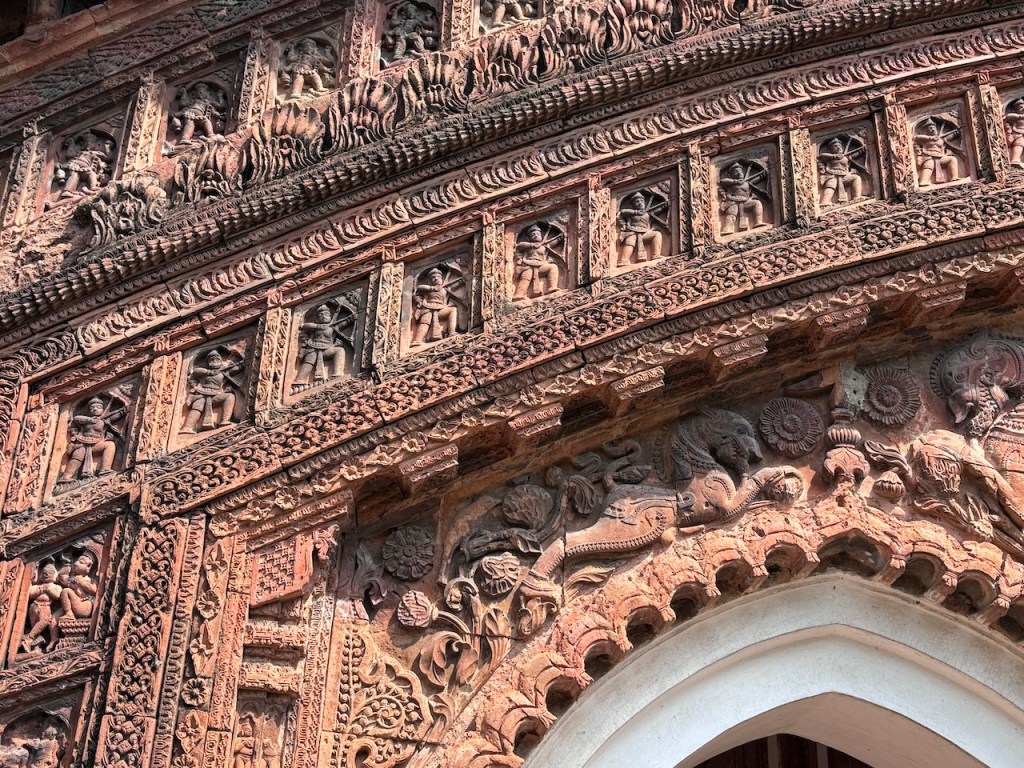 Like other temples it has a triple arched entrance but unlike other mandir it is almost at flat level. Most of the terracotta panels are intact depicting Bengal’s unique style of terracotta prevalent at that time. This temple has two entrances – one from the western side containing three doors and the other from the southern side. But the entrance from the southern side is used.