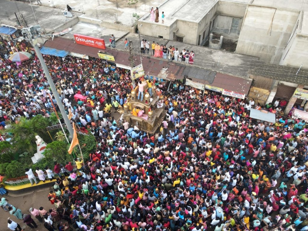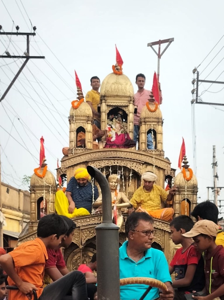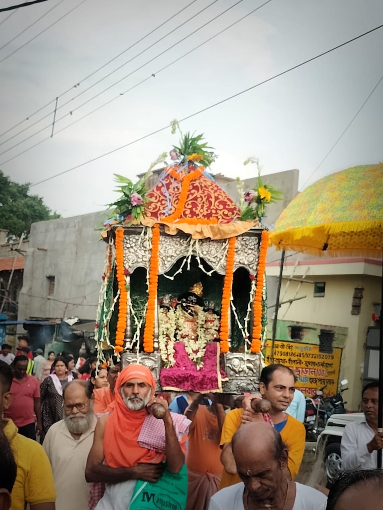On the evening of Rathayatra, Gopinath Jiu and Radharani came out from the main temple in a palanquin and brought to ratha griha. Before they get inside the chariot they move around it thrice. For the last fifteen years or so the chariot is drawn by a tractor but previously people used to draw it through the rope. The chariot began to move through the crowded streets with people and devotees of various age groups holding the rope. The rath went to Vajpayee More and returned from there. On both the days of the festival there happened to be a fair at the Rathtala Road in Ukhra.