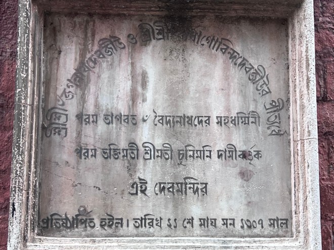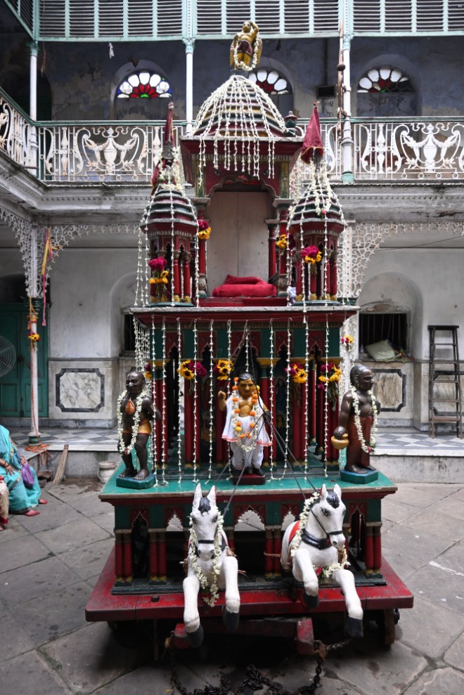 I witnessed the rathayatra of Chunimani Dasi in June 2023. Just before entering the house I saw two old structures of gas lamps on both sides of the entrance. It seemed previously the lamps lighted the entrance. What a nostalgic feeling! Presently, this thakurbari is a Grade – I heritage under Kolkata Municipal Corporation.