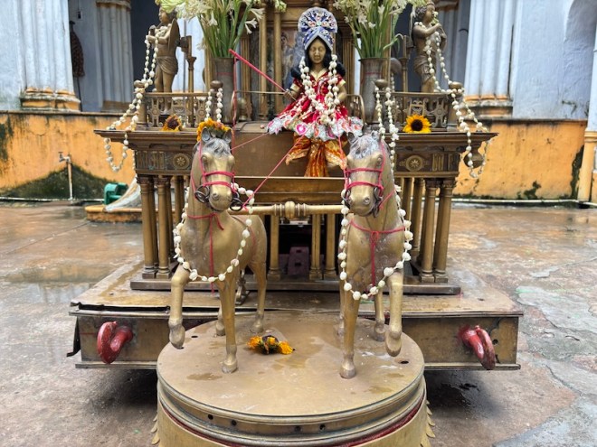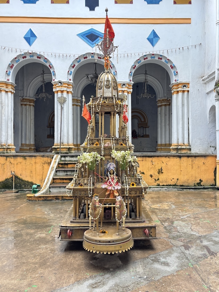 Rathayatra is one of the greatest festivals of Bengal. There are many bonedi houses in and outside Kolkata where this festival is celebrated in a grand way. The raths are mostly made of wood, though some are made of brass. One such house in North Kolkata where a brass chariot is drawn in the courtyard belongs to Tarak Pramanick.