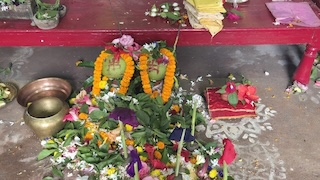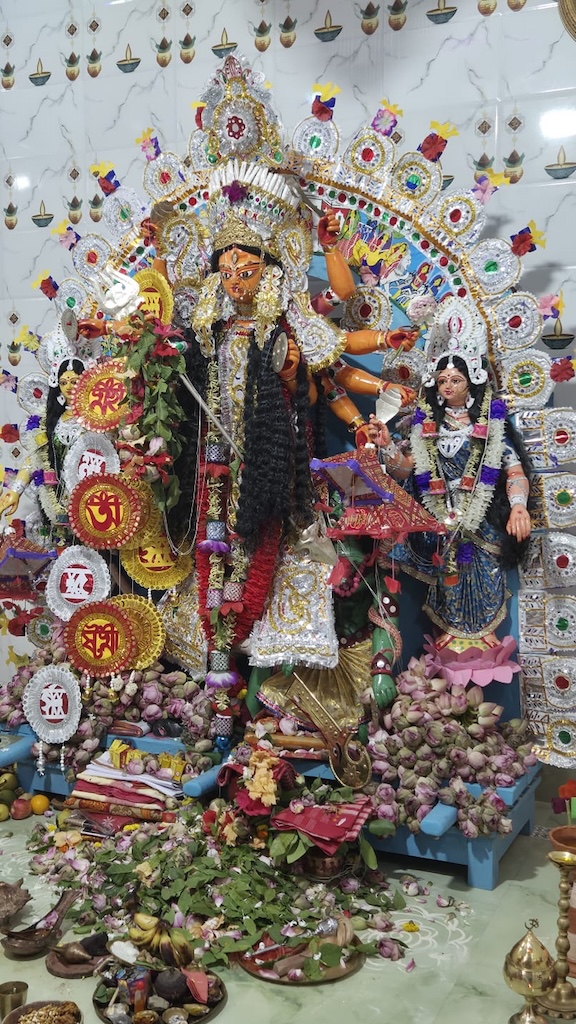An oil lamp known as pran pradip remains lighted during the days of the puja and the same is kept inside a glass chimney. There are two ghats – Bhairavnath ghat and Shanti kalas just below the idol. These are never immersed. The hom is known as Sagnik hom which starts from Saptami and continues till Nabami. The fire remains lighted. Maa Saraswati is not wearing any mukut (crown) . Kumari Puja is held on Mahastami.