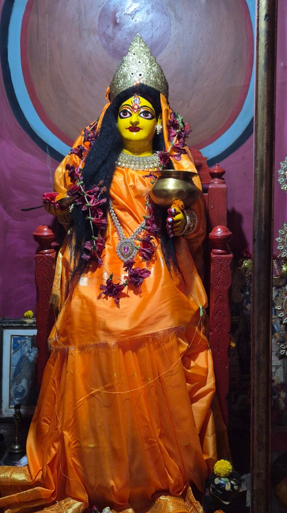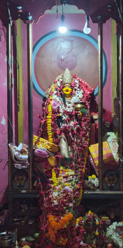 As told earlier there is an idol of Goddess Annapurna sitted on a wooden throne. Just above the door of this temple there is a very old stone plaque but presently unable to decipher. I have been told by the priest that the idol is made of wood. Special puja is performed on the day of Annapurna Puja.