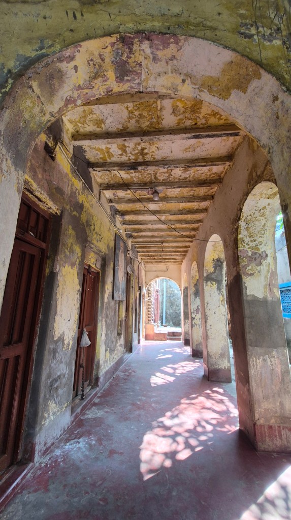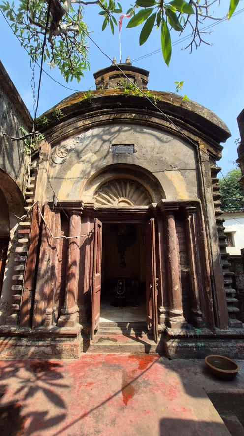 There is also an aatchala Shiva temple dedicated to Shree Shree Gangadhar Shibthakur built in 1289 Bangabda which corresponds to the same year of the building of this ghat. But the Shiva temple is a separate structure and can be seen from outside. Daily worship of all the deities are performed here. I have visited this thakurbati a number of times and, on each occasion, I have come across the priest performing puja.
