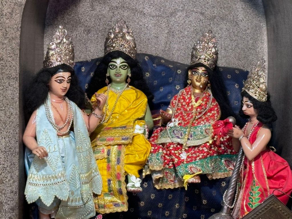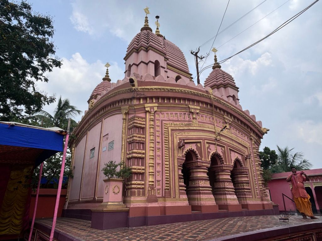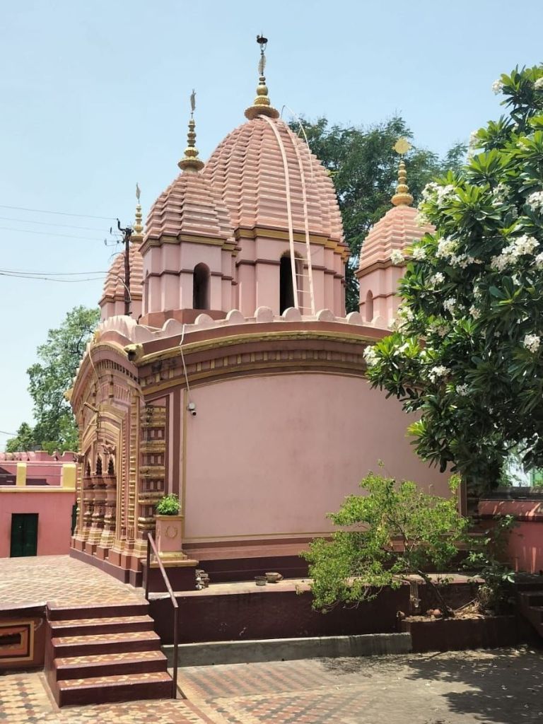 This pancha-ratna or five pinnacled temple is a modification of the “Bishnupur Type” with a façade broader than the height of the structure. The temple is built on a 3.5 feet platform above the ground and it covers an area of 1050 sq ft.