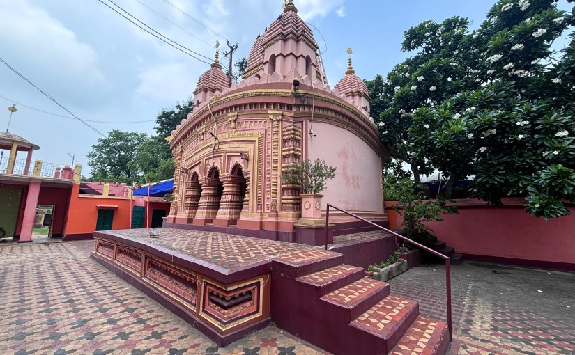 This pancha-ratna or five pinnacled temple is a modification of the “Bishnupur Type” with a façade broader than the height of the structure. The temple is built on a 3.5 feet platform above the ground and it covers an area of 1050 sq ft.